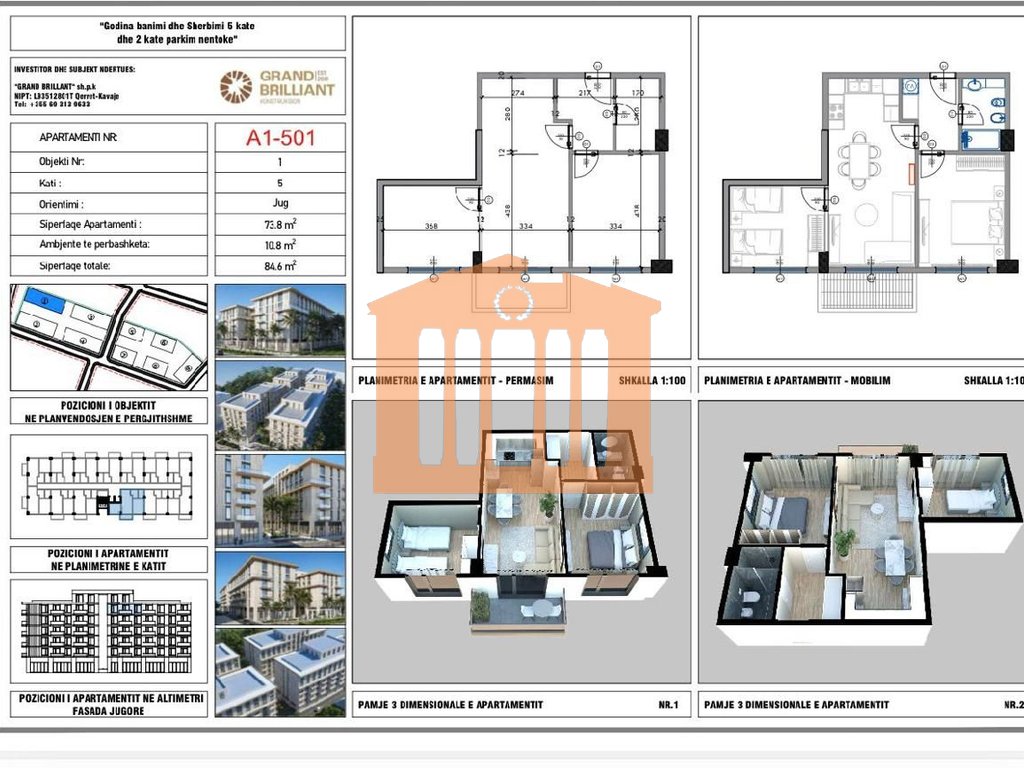 The apartment is located on the 5th floor of a new building with an elevator (still under construction) in the "PALM PARADISE" Residence in Qerret. This apartment has a total area of 84.6m2, of which 73.8m2 is indoor space organized into 1 living room + kitchen, 2 bedrooms, 1 bathroom, and a balcony. Built in 2024 with a completion date at the end of 2027, but expected to be finished before summer 2027. The area where this apartment is located has all facilities and is suitable for living, vacations, or even investment as it has now become a highly demanded and preferred zone. For more information or a property visit, please contact us.