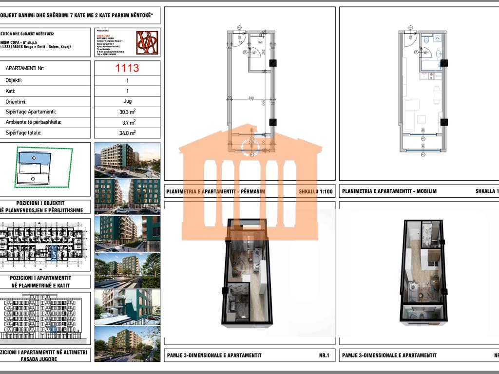 Ndodhet ne katin e 1 banimi ose i 2 nga toka ne godinen e pare me orjentim nga jugu, me siperfaqe totale prej 34m2, siperfaqe e brendshme 30.3m2, siperfaqe e perbashket 3.7m2 e cila organizohet ne open-space me 1 tualet dhe 1 ballkon. ""Rezidenca Vale Verde" eshte Rezidenca me e re qe do i shtohet Golemit me nje distanc nga deti per vetem 300 metra e cila pritet te perfundoj brenda vitit 2028. Ne katin perdhe do jen dyqane, 6 kate banimi dhe 2 kate nentoke per parking. Ne kete rezidence disponojm apartamente te tipologjive te ndryshme si: Apartamente 1+1, 2+1 dhe Garsoniere me mundesi pagese me keste dhe totale.
