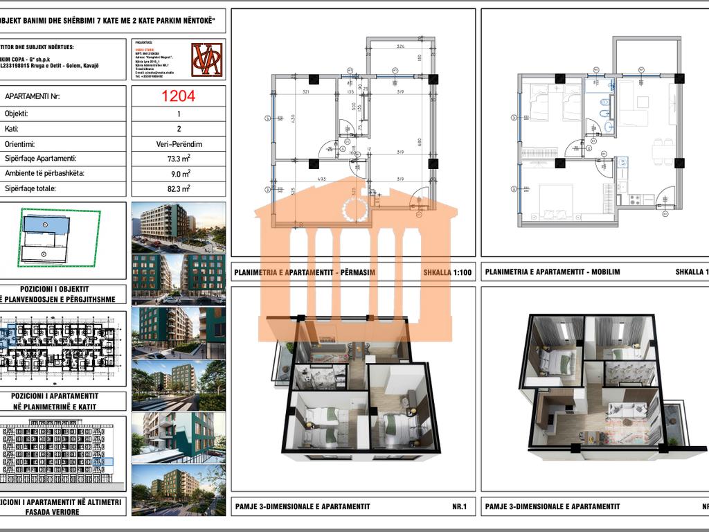 Ndodhet ne katin e 2 banimi ose i 3 nga toka ne godinen e pare me orjentim veri-perendim, me siperfaqe totale prej 82.3m2, siperfaqe e brendshme 73.3m2, siperfaqe e perbashket 9m2 e cila organizohet 1 koridor qe ben shperndarjen ne 1 dhome ndenje bashk me kendin e gatimit, 2 dhoma gjumi, 1 tualet dhe 1 ballkon. ""Rezidenca Vale Verde" eshte Rezidenca me e re qe do i shtohet Golemit me nje distanc nga deti per vetem 300 metra e cila pritet te perfundoj brenda vitit 2028. Ne katin perdhe do jene te vendosura dyqane, 6 kate banimi dhe 2 kate nentoke per parking. Ne kete rezidence disponojm apartamente te tipologjive te ndryshme si: Apartamente 1+1, 2+1 dhe Garsoniere me mundesi pagese me keste dhe totale.