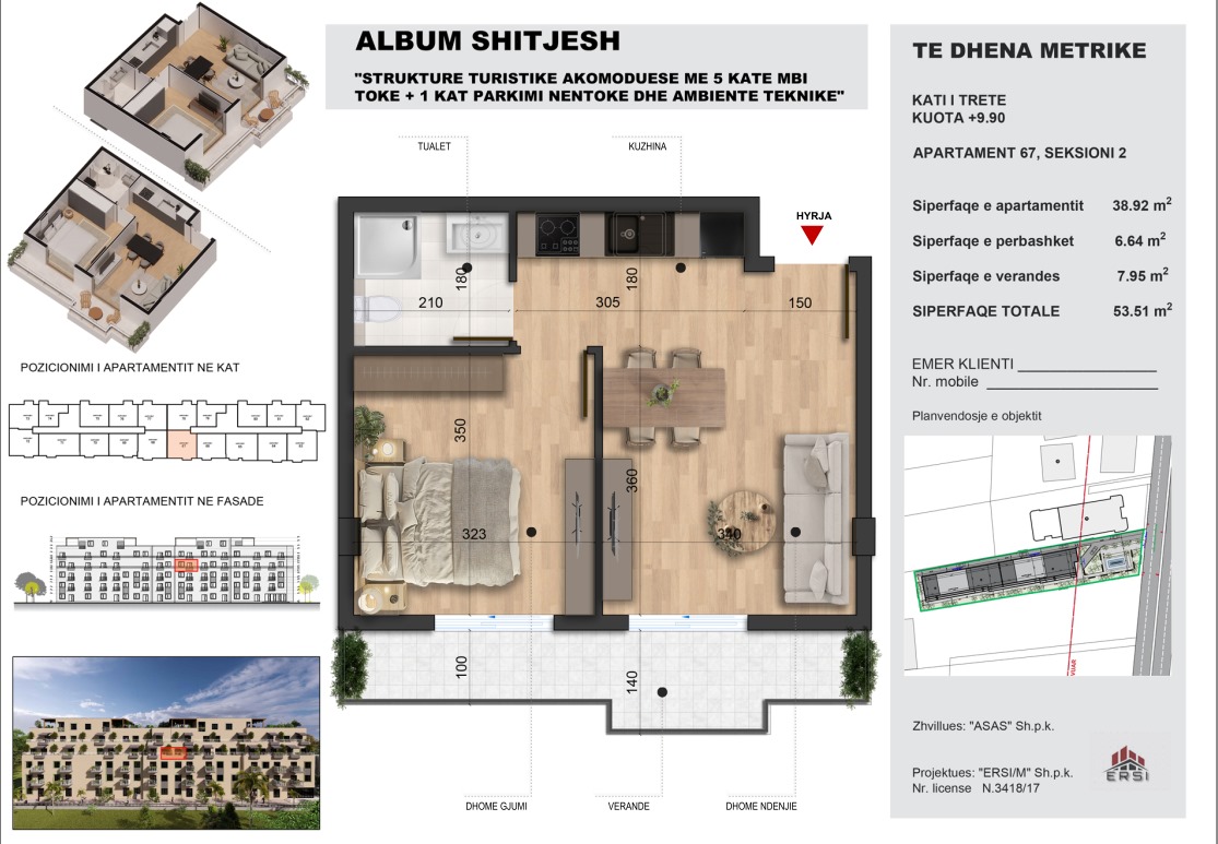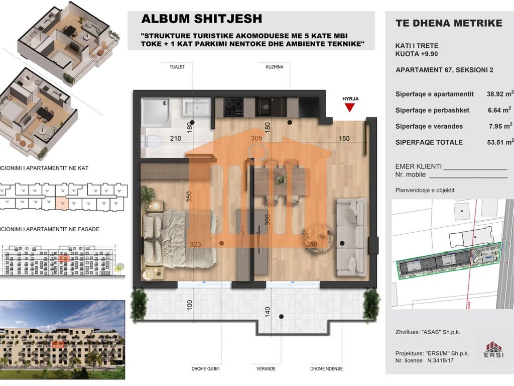 Apartamenti ndodhet ne katin e trete te banimit te nje godine 5-kateshe ne ndertim e siper ne Golem, afer Meteor. Disponon 53.51m2 totale, nga keto 6.64m2 siperfaqe e perbashket , 7.95m2 siperfaqe e ballkonit dhe 38.92m2 jane te brendshme. Organizohet ne nje dhome ndenje + kuzhine, 1 dhome gjumi, 1 tualet dhe nje ballkon. Objekti pritet te perfundoje per 18 muaj. Ka mundesi pagese me keste 30%, 30%,30% ,10% cdo gjashte muaj.Cmimi per m2 eshte 1050 euro per pagese me keste, ndersa per pagesat totale do te jete 1000 euro.Gjithashtu ofrohen dhe opsione te ngjashme qe variojne nga 43.94m2 totale-67.35m2 totale. Me nje lokacion teper te favorshem dhe me planimetri qe nuk ka shume metra ju jep mundesine te gjitheve per te blere apartament per jetese ose pushime.