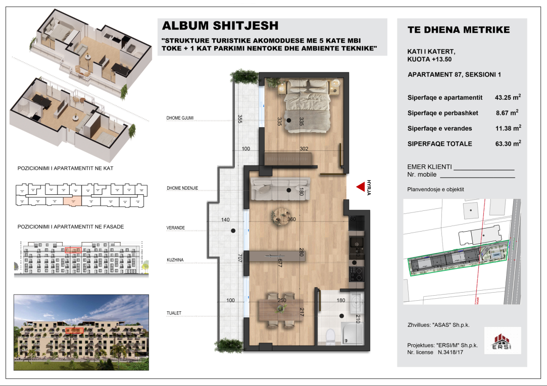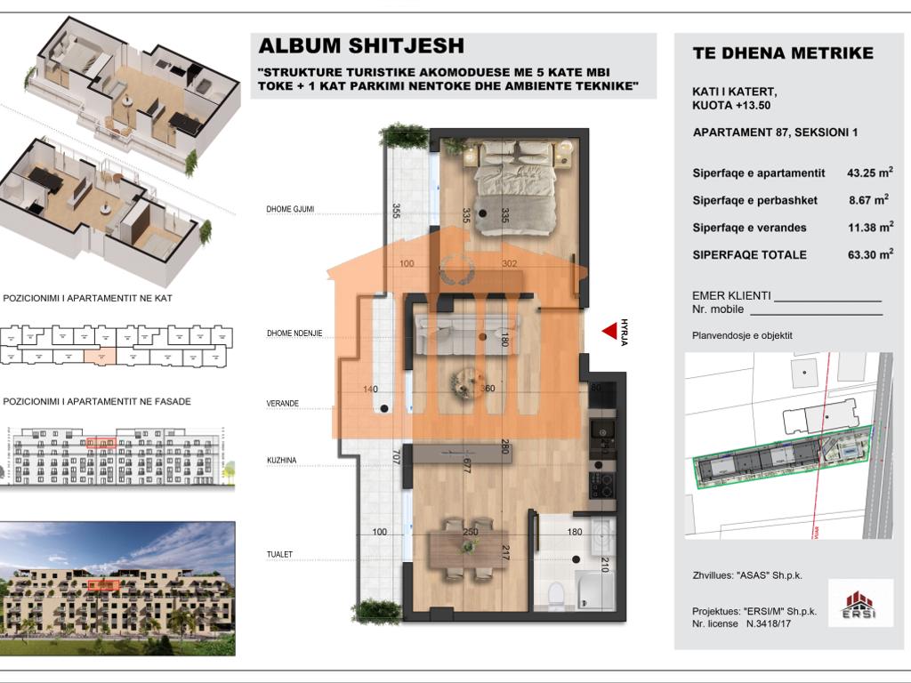 Apartamenti ndodhet ne katin e katert te banimit te nje godine 5-kateshe ne ndertim e siper ne Golem, afer Meteor. Disponon 63.30m2 totale, nga keto 8.67m2 siperfaqe e perbashket, 11.38m2 siperfaqe e ballkonit dhe 43.25m2 jane te brendshme. Organizohet ne nje dhome ndenje + kuzhine, 1 dhome gjumi, 1tualet dhe 1 ballkon. Objekti pritet te perfundoje per 18 muaj. Ka mundesi pagese me keste 30%, 30%,30%, 10% cdo gjashte muaj. Cmimi per m2 eshte 1050 euro per pagese me keste, ndersa per pagesat totale do te jete 1000 euro.Gjithashtu ofrohen dhe opsione te ngjashme qe variojne nga 43.94m2 totale-67.35m2 totale. Me nje lokacion teper te favorshem dhe me planimetri qe nuk ka shume metra ju jep mundesine te gjitheve per te blere apartament per jetese ose pushime.