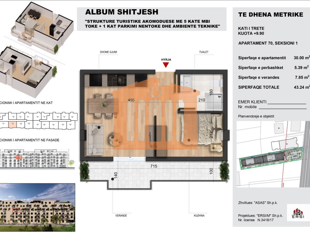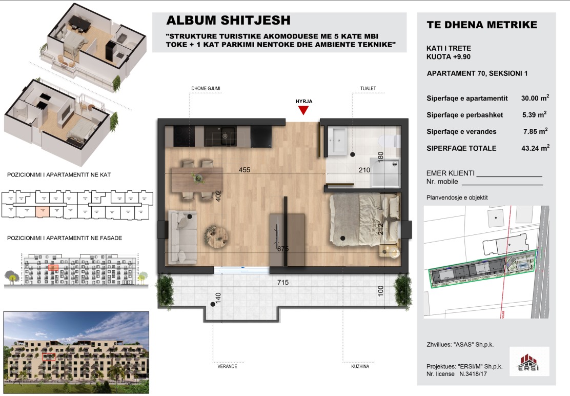 Apartamenti ndodhet ne katin e trete te banimit te nje godine 5-kateshe ne ndertim e siper ne Golem, afer Meteor. Disponon 43.24m2 totale, nga keto 5.39m2 siperfaqe e perbashket, 7.85m2 siperfaqe e ballkonit dhe 30m2 jane te brendshme. Organizohet ne nje open space,1 tualet dhe 1 ballkon. Objekti pritet te perfundoje per 18 muaj. Ka mundesi pagese me keste 30%, 30%,30%,10% cdo gjashte muaj.Cmimi per m2 eshte 1050 euro per pagese me keste, ndersa per pagesat totale do te jete 1000 euro.Gjithashtu kemi opsione te tjera te ngjashme te cilat variojne nga 30.40m2 totale - 43.69m2 totale. Me nje lokacion teper te favorshem dhe me planimetri qe nuk ka shume metra ju jep mundesine te gjitheve per te blere apartament per jetese ose pushime.