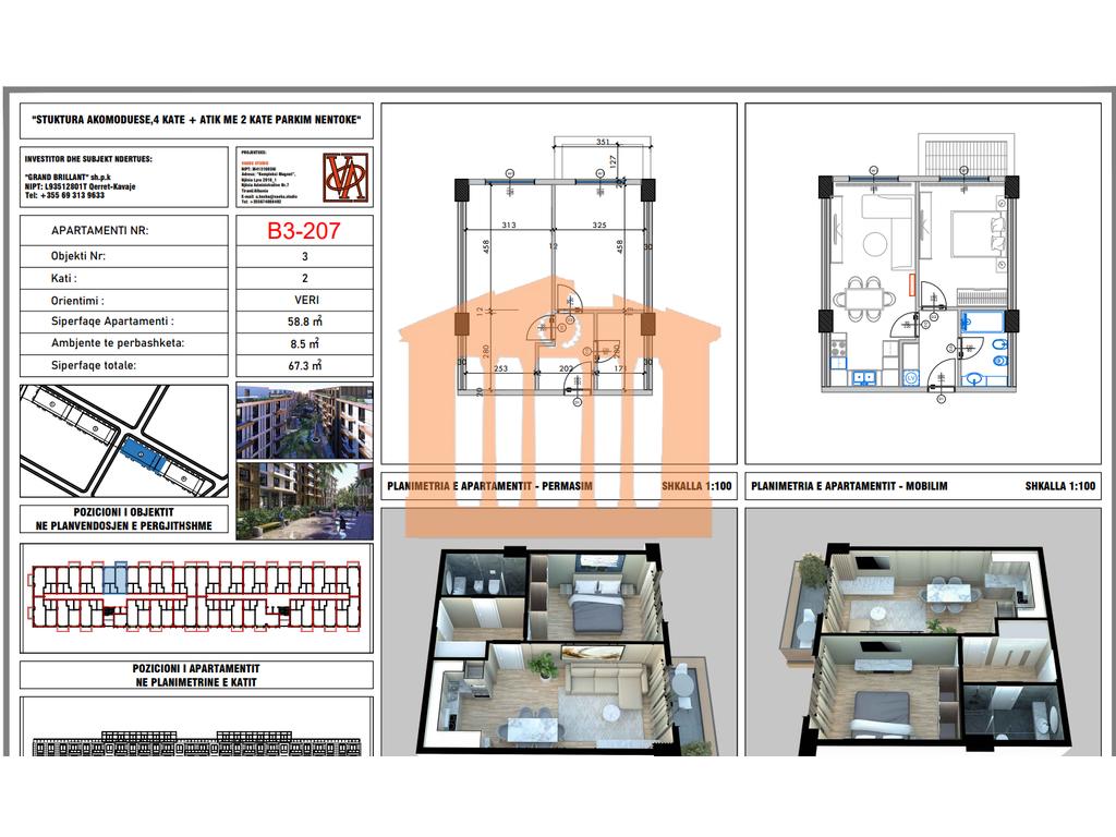 Apartamenti ndodhet ne katin e 2 te nje pallati te ri me ashensor(ende ne proces ndertimi)ne Rezidencen "PALM PARADISE" ne Qerret. Ky apartament ka orientim nga jugu dhe disponon 67.3 m2 siperfaqe totale nga te cilat 58.8 m2 jane siperfaqe e brendshme te cilat organizohen ne 1 dhome ndenje me kuzhine, 1 dhome gjumi, 1 tualet dhe nje ballkon. Ndertim i vitit 2025 dhe afati i perfundimit 24 muaj (2027).