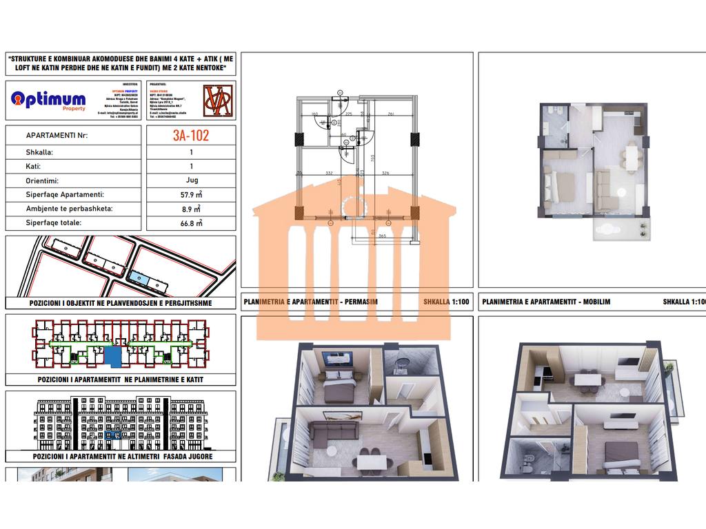 Apartamenti ndodhet ne katin e 1 te nje pallati te ri me ashensor(ende ne proces ndertimi) ne Rezidencen "Adria" ne Qerret. Ky apartament ka orientim nga jugu dhe disponon 66.8 m2 siperfaqe totale nga te cilat 57.9 m2 jane siperfaqe e brendshme te cilat organizohen ne 1 dhome ndenje me kuzhine, 1 dhome gjumi, 1 tualet dhe nje ballkon. Ndertim i vitit 2025 dhe afati i perfundimit ne fund te 2027. Zona ne te cilen ndodhet ky apartament eshte nje zone e cila disponon te gjitha fasilitetet dhe eshte e pershtatshme si per banim ashtu edhe per pushime pse jo edhe per investim pasi eshte shnderruar tashme ne nje zone shume te kerkuar dhe te preferuar.