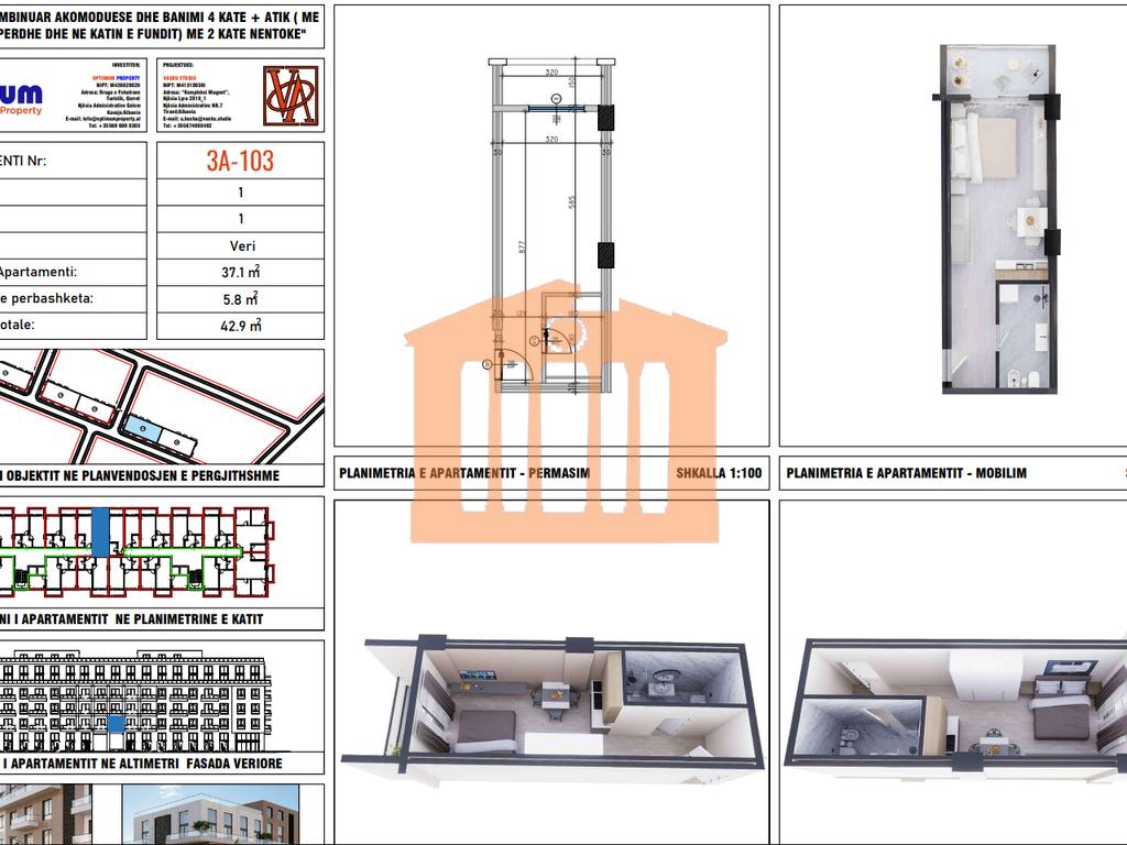 Garsonieria ndodhet ne katin e 1 te nje pallati te ri me ashensor(ende ne proces ndertimi) ne Rezidencen "Adria" ne Qerret. Ky apartament ka orientim nga jugu dhe disponon 42.9m2 siperfaqe totale nga te cilat 37.1 m2 jane siperfaqe e brendshme te cilat organizohen ne 1 open-space 1 tualet dhe nje ballkon. Ndertim i vitit 2025 dhe afati i perfundimit nr fund te 2027.
