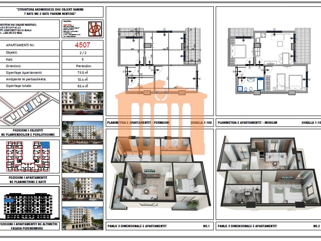 Apartamenti ndodhet ne katin e 5 te nje pallati te ri me ashensor(ende ne proces ndertimi) ne Rezidencen "Blue Horizon" ne Qerret. Ky apartament ka orientim nga jugu dhe disponon 83.4 m2 siperfaqe totale nga te cilat 73 m2 jane siperfaqe e brendshme te cilat organizohen ne 1 dhome ndenje me kuzhine, 2 dhoma gjumi, 1 tualet dhe nje ballkon. Ndertim i vitit 2025 dhe afati i perfundimit ne fund te 2027. Zona ne te cilen ndodhet ky apartament eshte nje zone e cila disponon te gjitha fasilitetet dhe eshte e pershtatshme si per banim ashtu edhe per pushime pse jo edhe per investim pasi eshte shnderruar tashme ne nje zone shume te kerkuar dhe te preferuar.