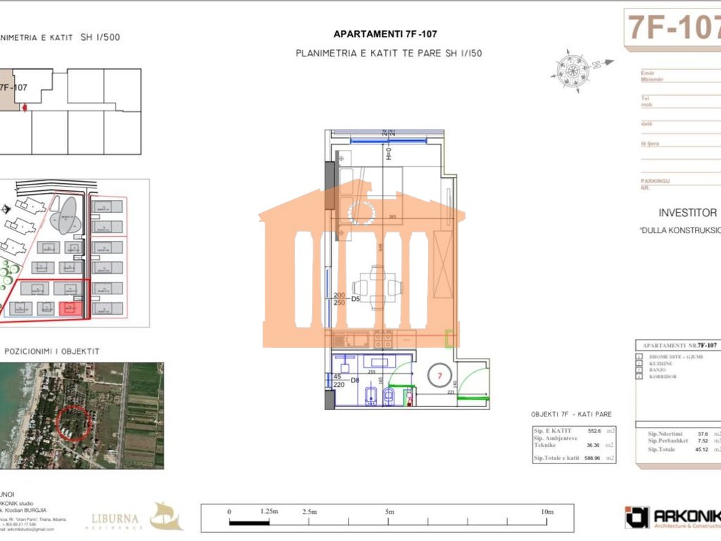 Garsonieria ndodhet ne katin e 2 te nje pallati te ri pjese e Rezidences "Liburna" ne Golem. Apartamenti disponon 45.12 m2 siperfaqe totale ku nga keto 37.6 m2 jane siperfaqe e brendshme te cilat organizohen ne 1open-space dhe nje tualet . Liburna Residence ndodhet ne zonen e Golemit ne Rrugen Bulevardi i Pishave, vetem 70 m larg nga deti. Me nje cilesi absolute ndertimi, standart i certifikuar i materialeve te perdorura, hapesirave rekreative, ambiente relaksuese dhe ambiente biznesi e hapesire parkimi nentoke per cdo njesi banimi ku ne fokus jane nevojat e banoreve per nje jetese komode.