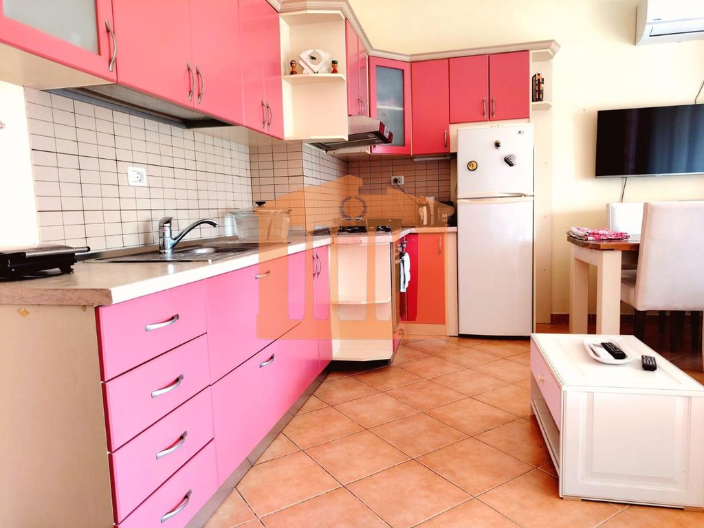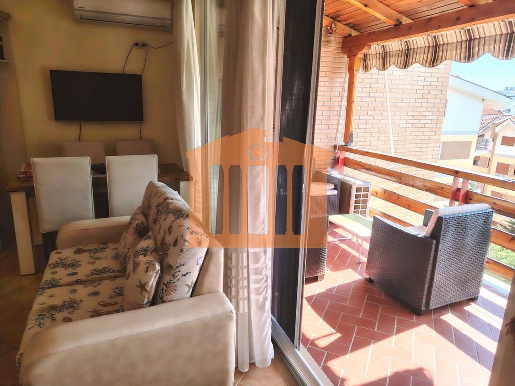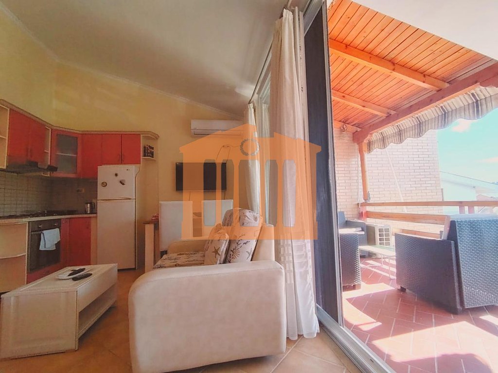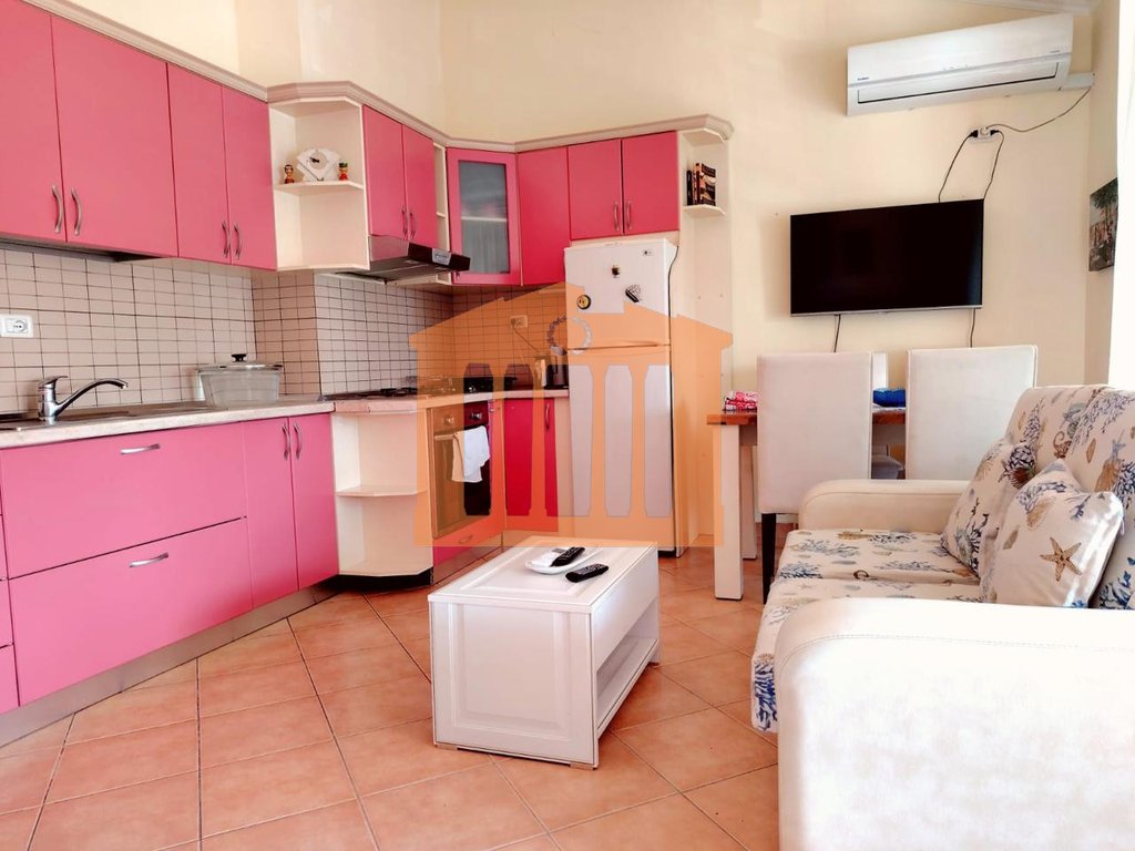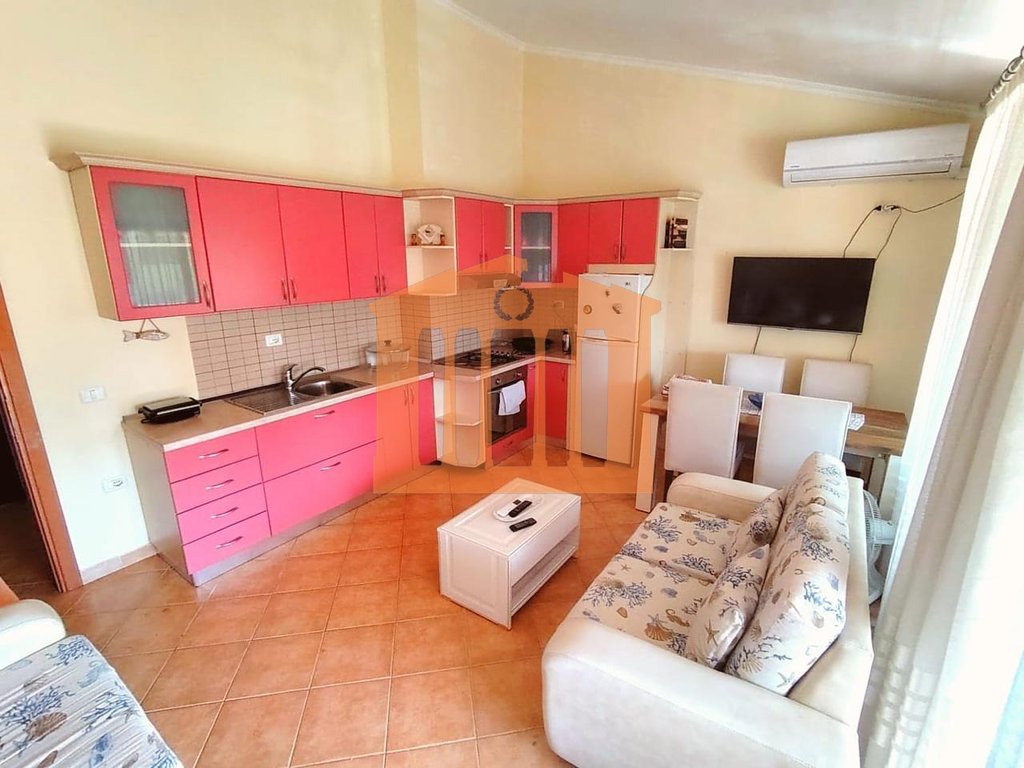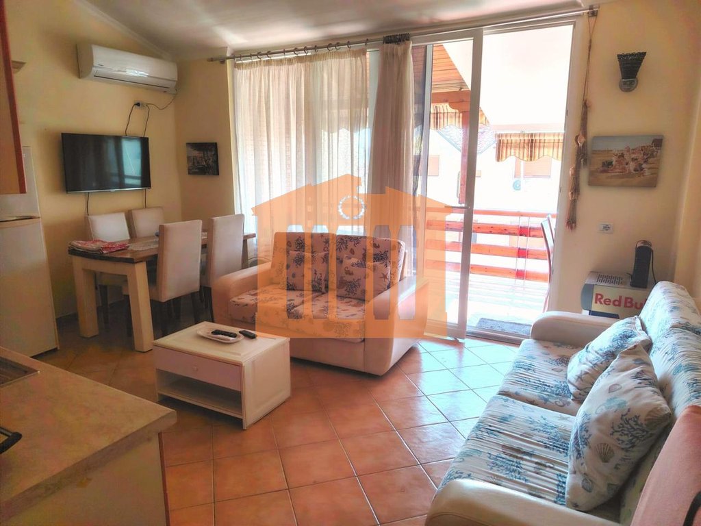Apartamenti ndodhet ne katin e 4t te nje pallati pa ashensor ne golem rreth 200m larg nga deti . Disponon 65m2 totale nga keto 60m2 jane te brendshme te cilat organizohen nga nje korridor qe ben shperndarjen e nje dhome ndenjeje+kuzhine, nje dhome gjumi, nje tualet dhe nje ballkon me pamje deti . Zona ne te cilen ndodhet eshte nje zone e pershtatshme per pushime pasi i ofron te gjitha facilitetet.