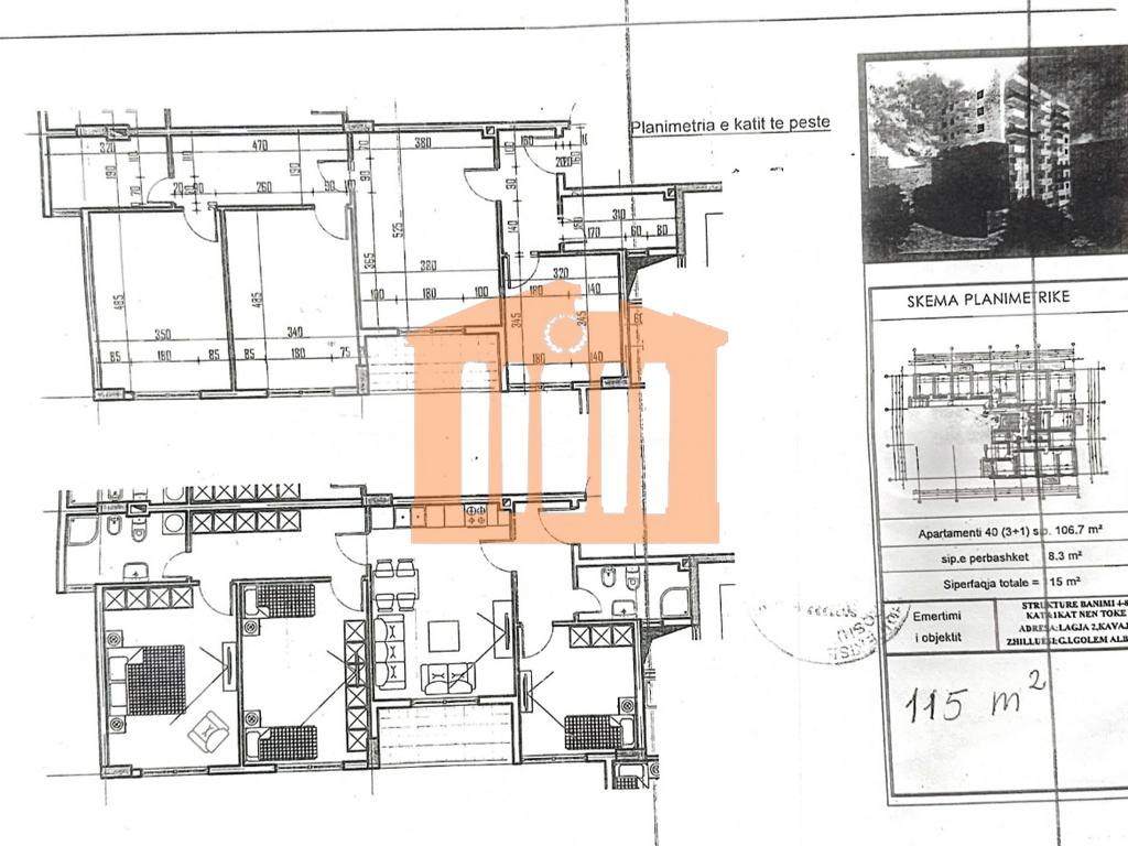 Apartamenti ndodhet ne katin e 5 te nje godine 8 kateshe ne qytetin e Kavajes,prane Tregut. Apartamenti disponon 115 m2 siperfaqe totale, nder te cilat 106.7 siperfaqe te brendshme, te cilat organizohen ne 1 dhome ndenje + kuzhine, 3 dhoma gjumi, 2 tualete dhe 1 ballkon. Kjo rezidence eshte nje zone shume e favorshme e cila ofron nje sere komoditetesh si per banim ashtu edhe per ide e qellime investimi.