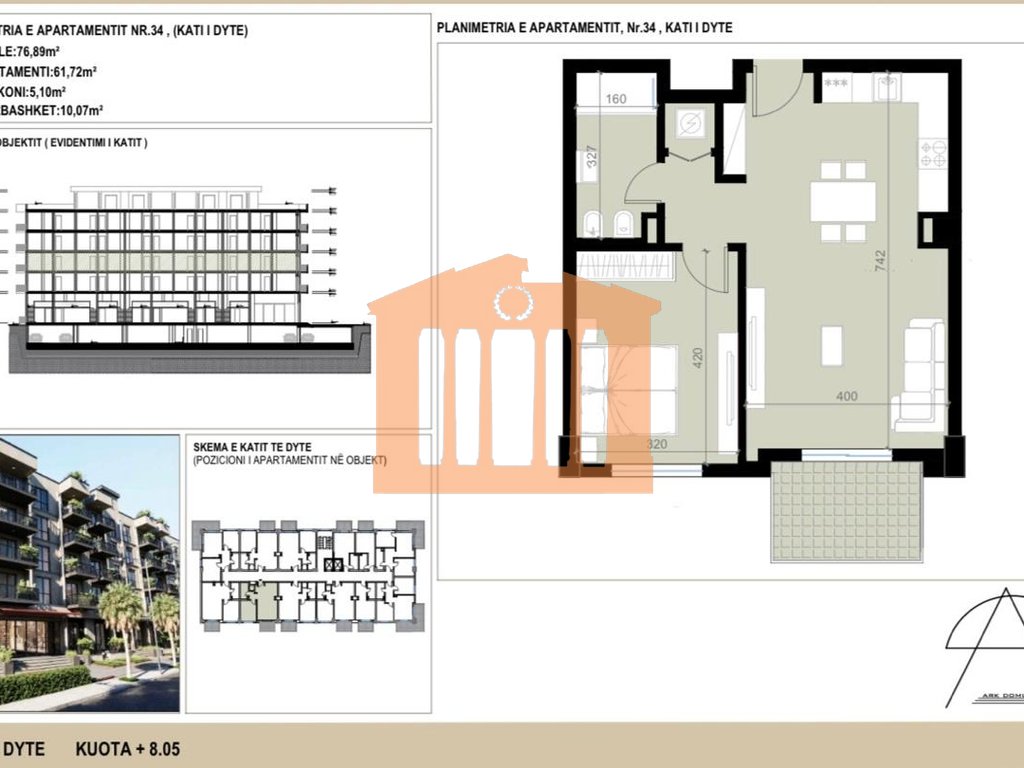 Apartamenti ndodhet 300 m larg nga deti dhe 100 m larg nga qendra ne katin e dyte te nje pallati te ri gjashte katesh me ashensor, i cili eshte ne proces ndertimi ne Residencen Roadside ne Golem. Prona disponon siperfaqe totale 76.89 m2, ku siperfaqe te brendshme jane 61.72 m2 dhe siperfaqe te perbashket jane 10.07 m2 dhe eshte e organizuar ne nje korridor shperndares, nje dhome ndenje se bashku me kuzhinen, nje dhome gjumi, nje tualet dhe nje ballkon. Kati nentoke -1 disponojne poste parkimi me nje siperfaqe prej 25.81m2 me nje cmim fiks prej 15.000 euro. Residenca “Roadside”, e projektuar per te ofruar elegance, luks, qetesi, nje stil jetese mesdhetar dhe vjen si nje nder zhvillimet me te reja dhe me cilesore ne zonen e Golemit, ku ndertohet me standarde te larta ndertimi dhe pritet te perfundoje brenda 2 viteve, duke garantuar nje investim te sigurt dhe afatgjate. Projekti eshte menduar per te ofruar funksionalitet maksimal, ambiente të bollshme dhe pamje te hapura drejt zones bregdetare.