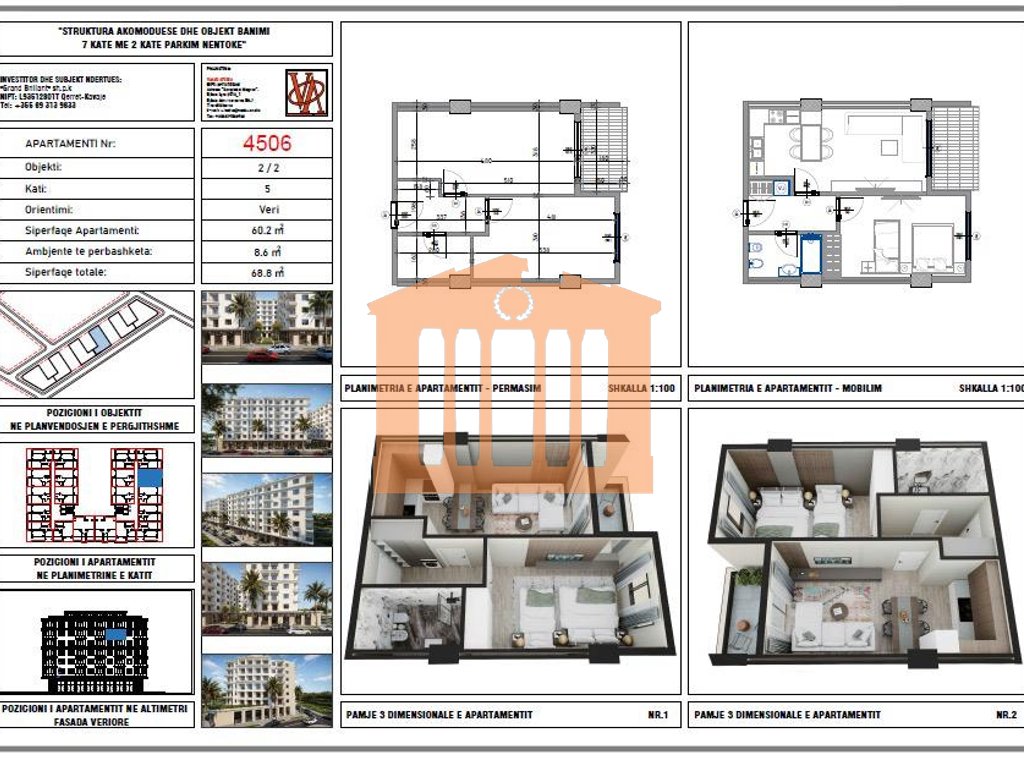 Apartamenti ndodhet ne katin e peste te nje pallati te ri me ashensor(ende ne proces ndertimi) ne Rezidencen "Blue Horizon" ne Qerret. Ky apartament ka orientim nga veriu dhe disponon 68.8 m2 siperfaqe totale nga te cilat 60.2 m2 jane siperfaqe e brendshme te cilat organizohen ne nje dhome ndenje se bashku me kuzhinen, nje dhome gjumi, nje tualet dhe nje ballkon. Ndertim i vitit 2025 dhe afati i perfundimit ne fund te 2027. Zona ne te cilen ndodhet ky apartament eshte nje zone e cila disponon te gjitha fasilitetet dhe eshte e pershtatshme si per banim, per pushime pse jo edhe per investim pasi Qerreti tashme eshte shnderruar ne nje zone shume te kerkuar dhe te preferuar per banim. Apartamenti shitet me nje cmim prej 75,680 euro
