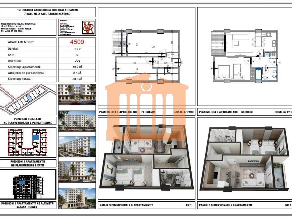 Apartamenti ndodhet ne katin e peste te nje pallati te ri me ashensor (ende ne proces ndertimi) ne Rezidencen "Blue Horizon" ne Qerret. Ky apartament ka orientim nga jugu dhe disponon 68.8 m2 siperfaqe totale nga te cilat 60.2 m2 jane siperfaqe e brendshme te cilat organizohen ne nje dhome ndenje se bashku me kuzhinen, nje dhome gjumi, nje tualet dhe nje ballkon. Ndertim i vitit 2025 dhe afati i perfundimit ne fund te 2027. Zona ne te cilen ndodhet ky apartament eshte nje zone e cila disponon te gjitha fasilitetet dhe eshte e pershtatshme si per banim, per pushime pse jo edhe per investim pasi Qerreti tashme eshte shnderruar ne nje zone shume te kerkuar dhe te preferuar per banim. Apartamenti shitet me nje cmim prej 75,680 euro