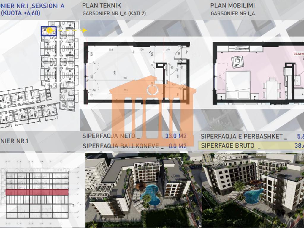 Apartamenti ndodhet ne katin e 5-te nje pallati te ri me ashensor (ende ne proces ndertimi) ne Rezidencen ''Azure Coast'', vetem 350m larg nga deti, ne Mal te Robit. Prona disponon siperfaqe totale 38.6 m2, ku siperfaqe e brendshme eshte 33 m2 dhe organizohet ne nje dhome ndenje dhe nje tualet.