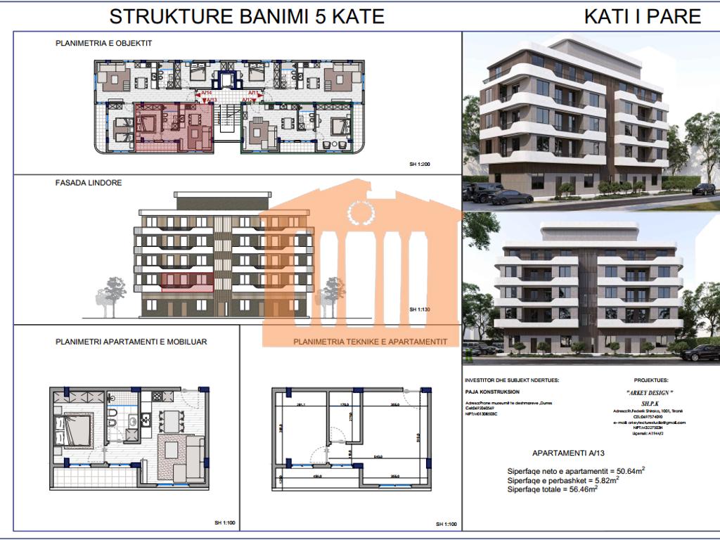 Apartamenti ndodhet ne katin 1 banim ose katin e 2 nga toka ne nje projekt ne ndertim e siper ne zonen e Plazhit te Durresit, prane ures se Dajlanit, vetem 190m larg detit Adriatik. Disponon 56.46m2 siperfaqe totale dhe eshte i organizuar nga nje dhome te madhe ndenje,1 tualet, 1 dhome gjumi dhe 1 ballkon me orientim jug-lindje. Ky projekt pritet te perfundohet brenda dhjetorit 2026 dhe gjithashtu ofrohet mundesia e pageses me 2 keste sipas fazes se ndertimit. Risi ne kete objekt eshte edhe mundesia e blerjes me kredi pasi 4 katet e para te godines jane aktualisht me certifikate pronesie.
