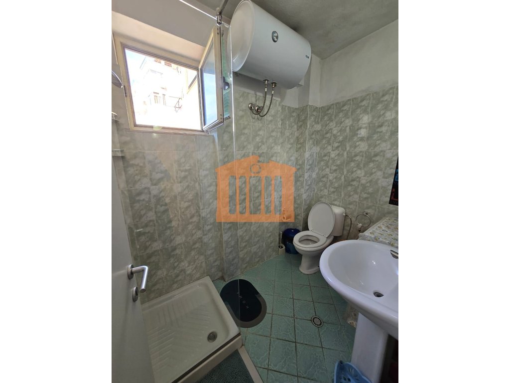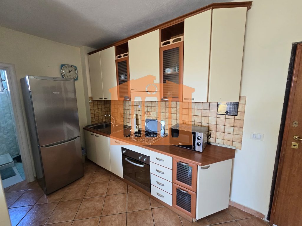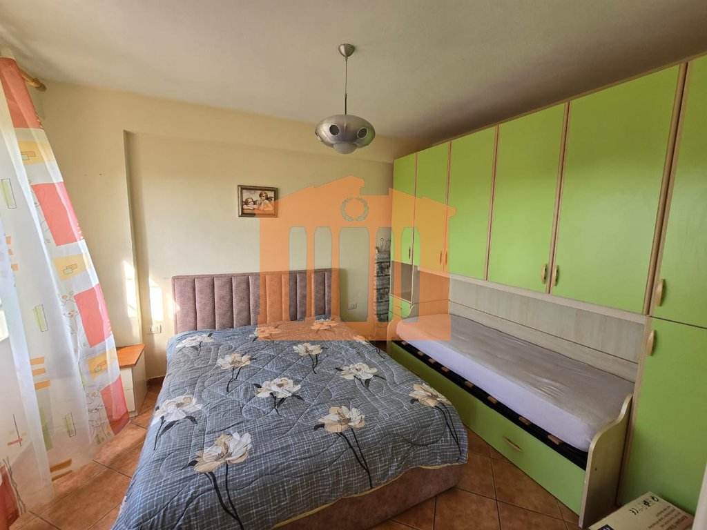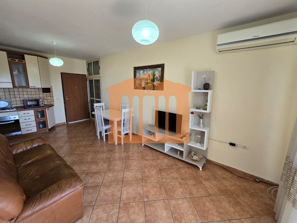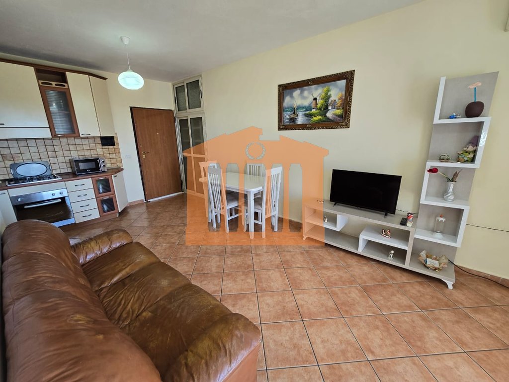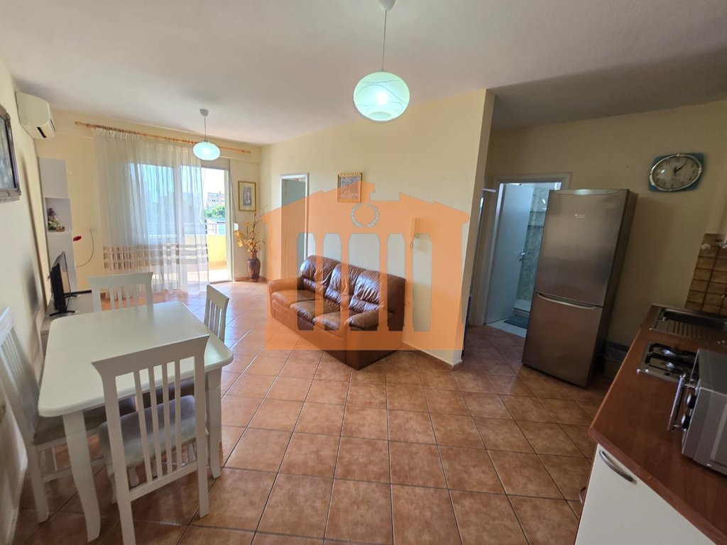 Apartamenti ndodhet ne katin e 5-te te banimit te nje pallati te ri me ashensor ne Plazh perballe kompleksit Florida. Organizohet ne nje korridor qe ben shperndarjen e ambienteve ne nje dhome ndenje+kuzhine, 1 dhome gjumi, 1 tualet me dritare dhe nje ballkon i bollshem ku ofron nje pamje te lire. Apartamenti eshte i mobiluar ne menyre komode dhe jepet me qira per periudhe afatgjate me nje vlere 35.000 lek/muaj, nuk preferohen kafshet shtepiake.
